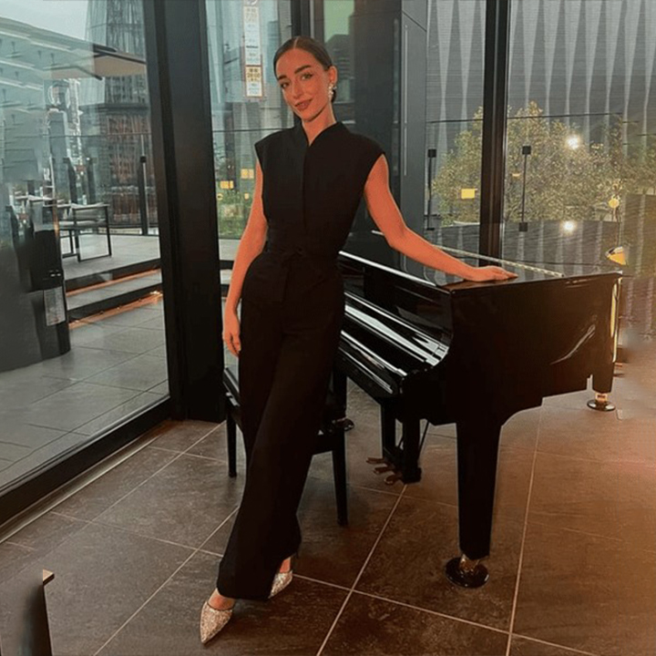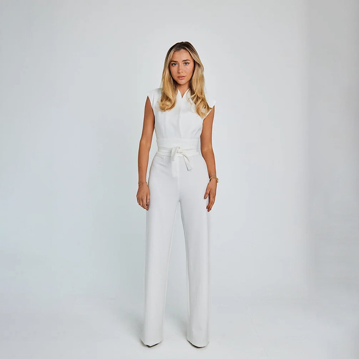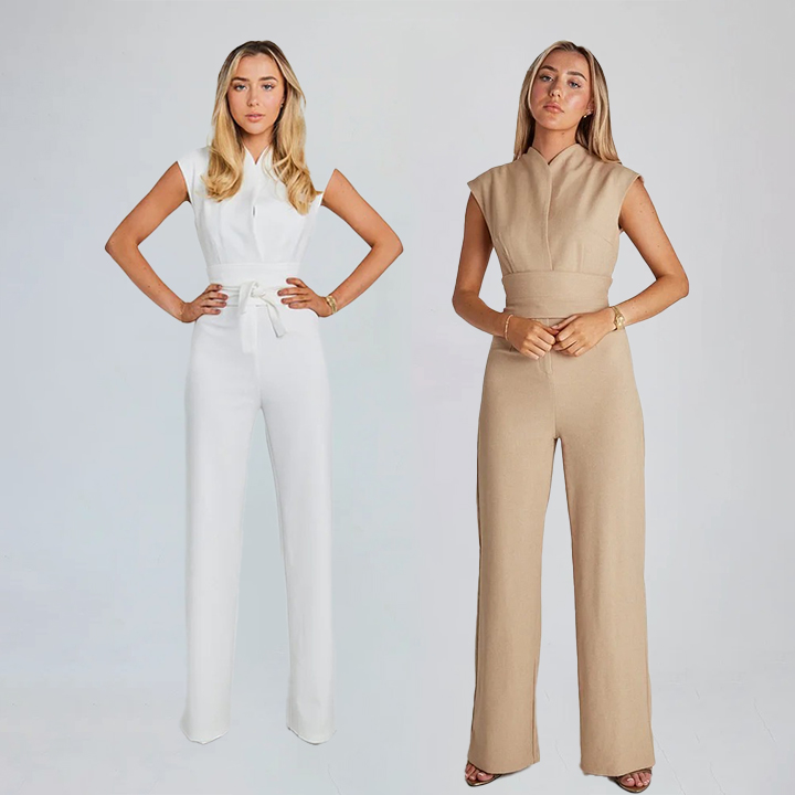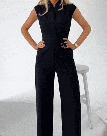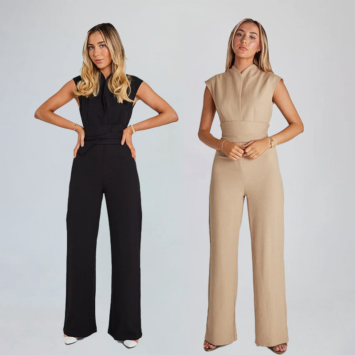 Sleeveless jumpsuit for all seasons. 70s inspired flared trousers with a sleeveless fit, double lining and waist belt. Various dressing styles. Stylish and comfortable. This is the ultimate show-stopping piece for your forever wardrobe.